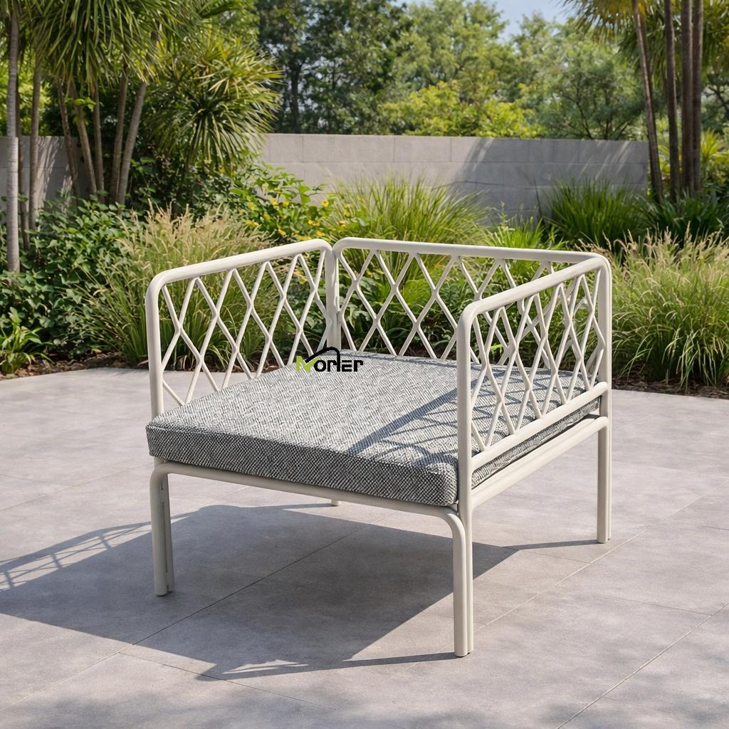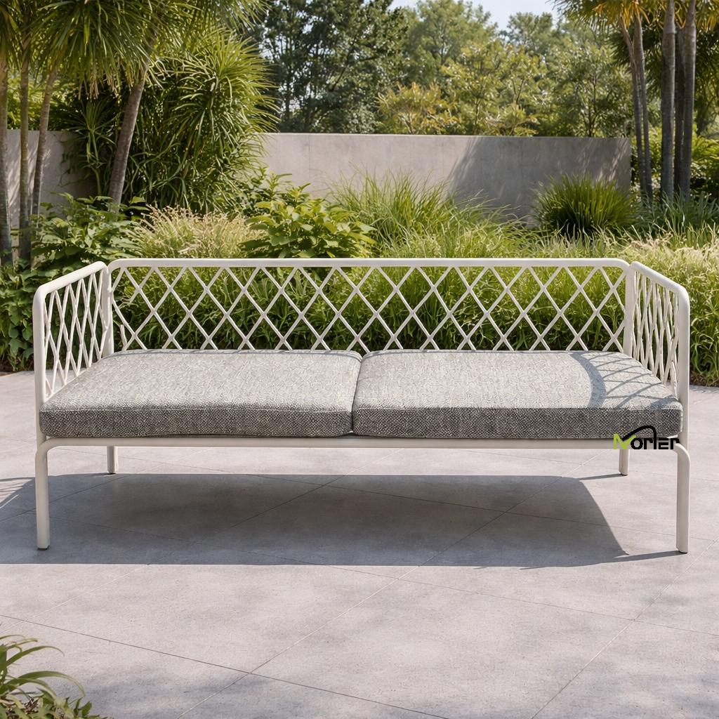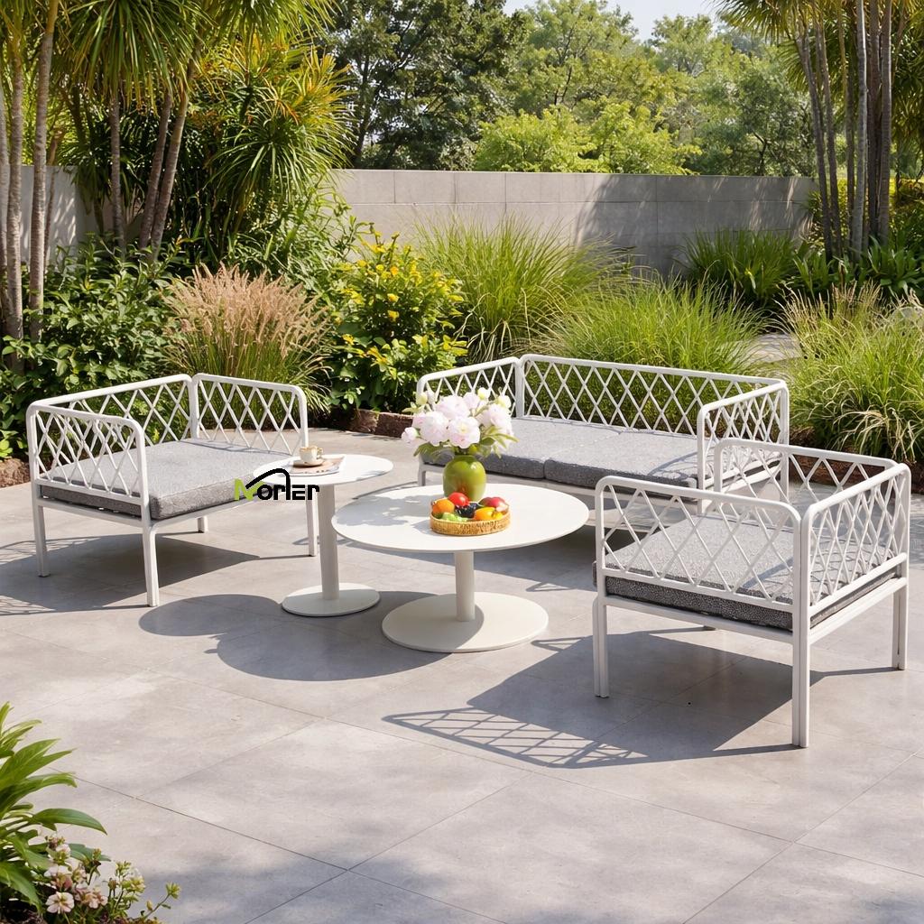 Nagtatampok ang modernong outdoor sofa set na ito ng malinis at minimal na disenyo na may magandang geometric na metal na frame. Ang istraktura ng bukas na sala-sala ay lumilikha ng isang magaan at eleganteng hitsura habang pinapanatili ang malakas na suporta sa istruktura.
